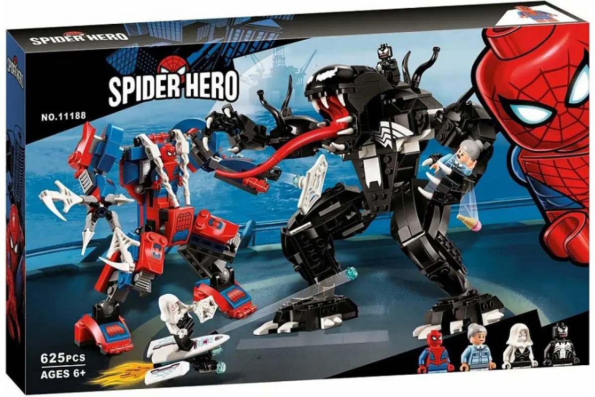 Конструктор (11188) Человек-паук против Венома,625 деталей Приготовьтесь к решающей битве Супергероев! Этот масштабный набор из 625 деталей воспроизводит легендарное противостояние Человек-Паук и его самого свирепого врага — Венома. Ключевые Особенности Набора: Два Мощных Мега-Роботы: Костюм Венома: Гигантский, зловещий робот, имеющий размеры 18х8х22 см. Берегитесь его ядовитого языка и острых когтей! Костюм Человека-Паука: Более маневренный робот-меситель размером 11х4х14 см. Оснащен специальными шутерами, которые стреляют паутиной. Полная Боевая Готовность: Подвижные Концовки: Оба костюма имеют полностью подвижные конечности, что позволяет воспроизводить динамичные сцены боя. Распашные Кабины: Каждый робот имеет кабину, куда можно легко поместить подходящую минифигурку (Человек-Паука или Венома). Полный Комплект Персонажей: В набор входят 4 мініфігурки для воссоздания увлекательного сюжета: Человек-Паук, Призрак-Паук, Веном и тетушка Мэй. Сценарий Мисии: Объедините усилия Человек-Паук и Призрак-Паук, чтобы спасти тетушку Мэй из пазуров огромного робота Венома! Стреляйте механическими пауками и паутиной, атакуйте на ховерборде Призрачного Паука и используйте когти робота Человек-Паук, чтобы поймать Венома и положить конец нападения симбиотов.